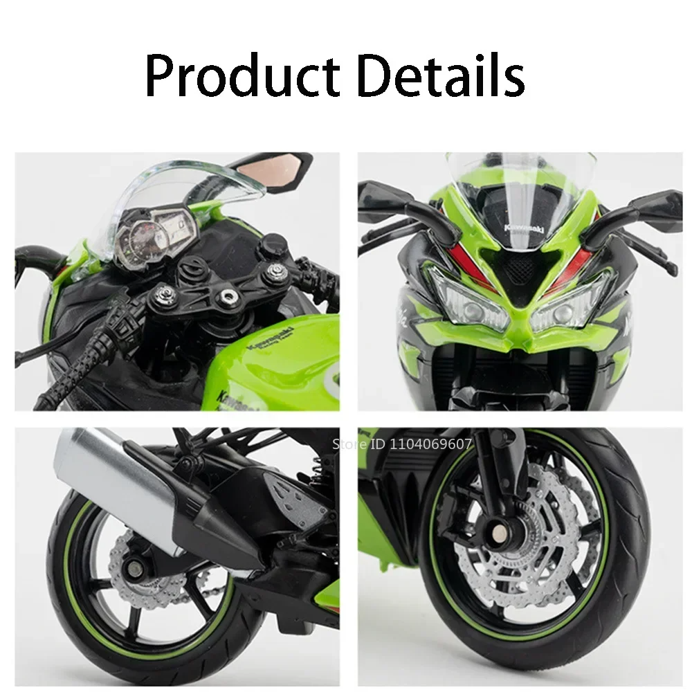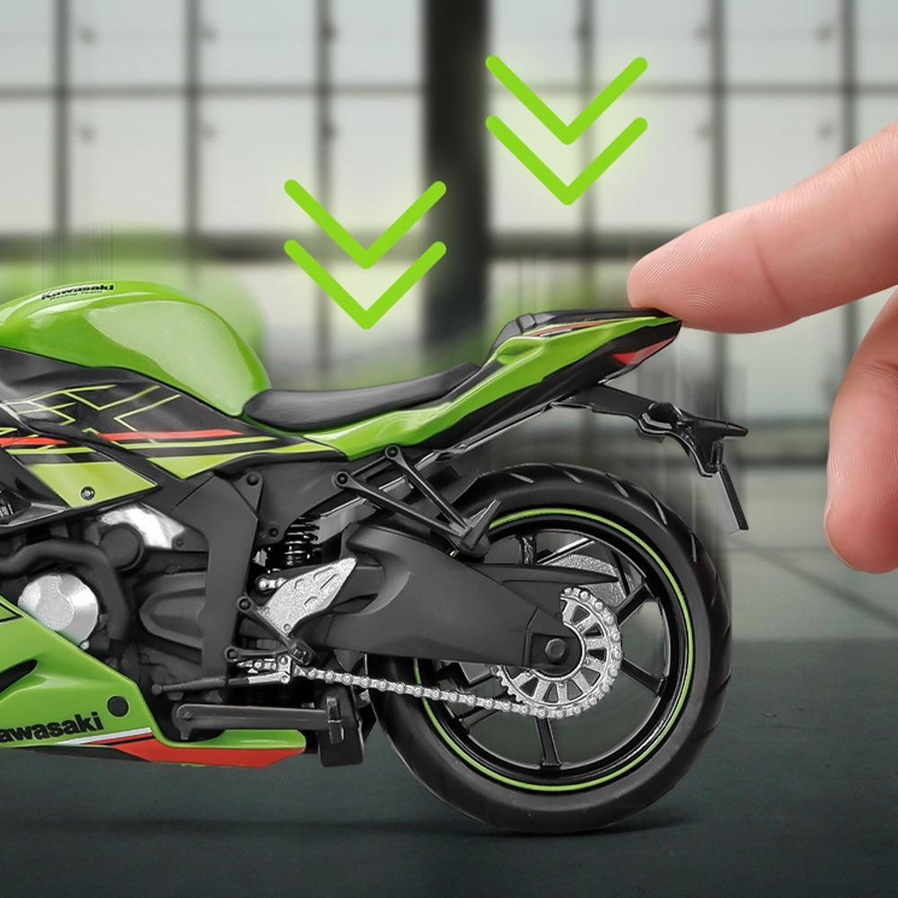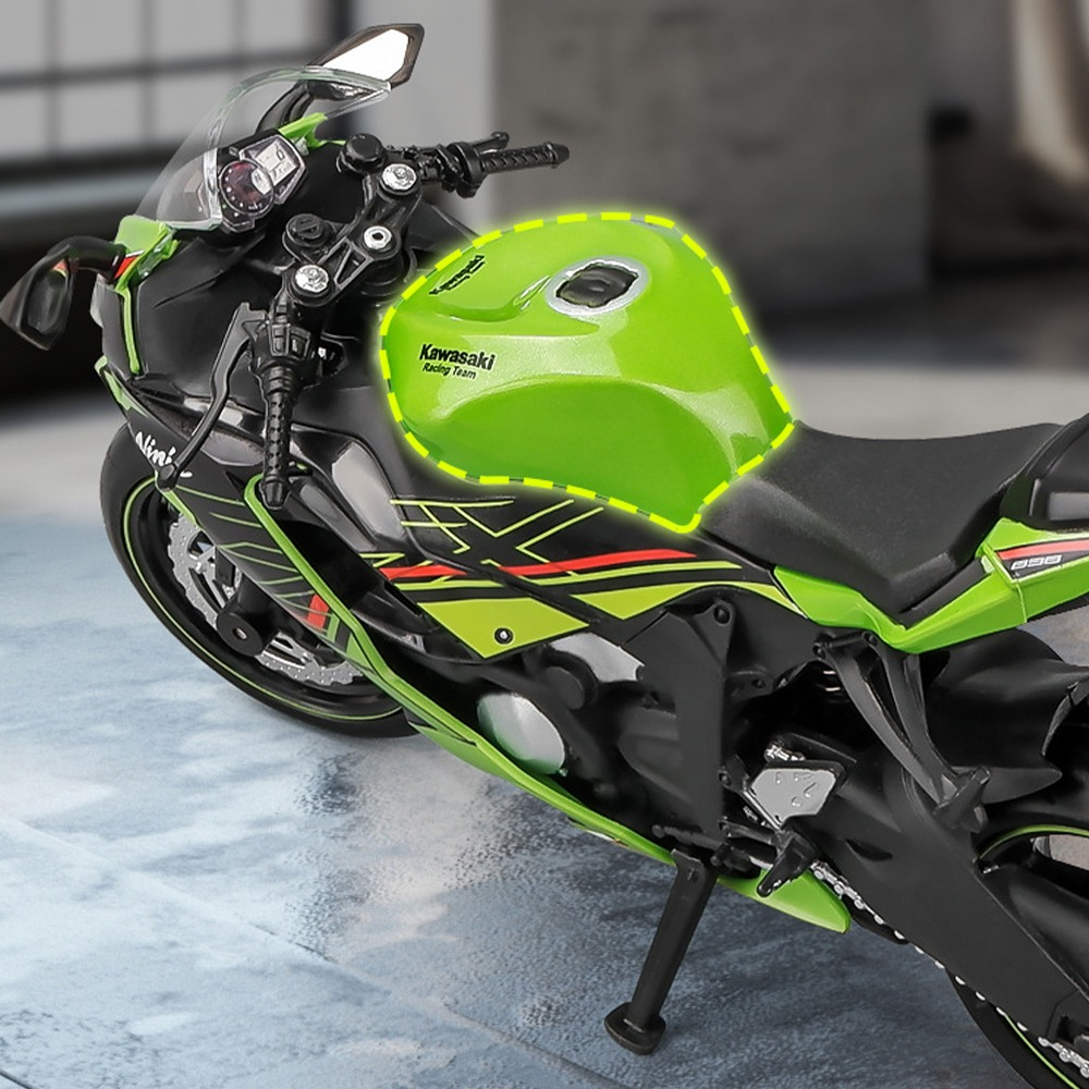 Quando você olha de perto, vê detalhes que vão além do visual: estrutura em metal diecast combinada com partes plásticas de qualidade, pneus de borracha e pintura cuidadosa que reproduzem com fidelidade a identidade da Kawasaki. Esse nível de acabamento deixa a miniatura pronta para exposição, fotografia e composição com outros itens automotivos, seja em casa, escritório ou loja.
