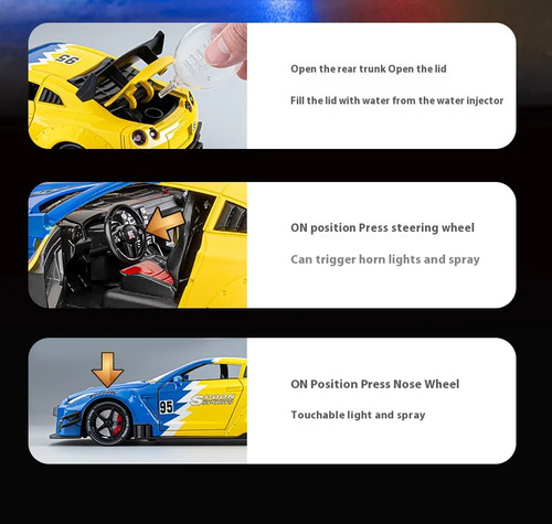 Ao acionar os efeitos, o modelo ganha vida: luzes se acendem, o som entra em cena e um efeito de fumaça aparece na traseira, simulando queima de pneu. É a combinação perfeita de colecionável e diversão, que impressiona adultos e crianças.