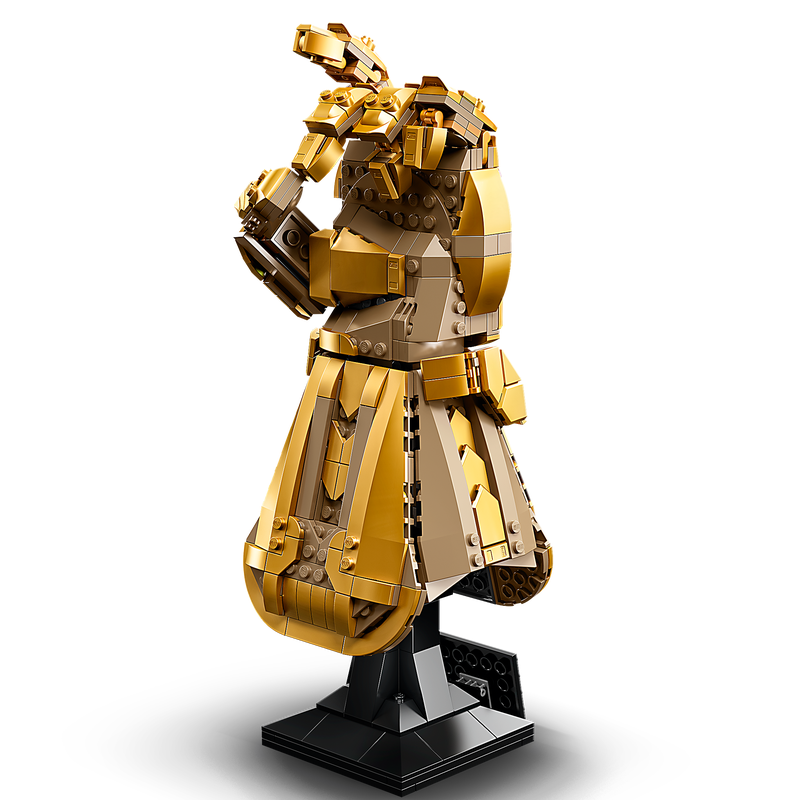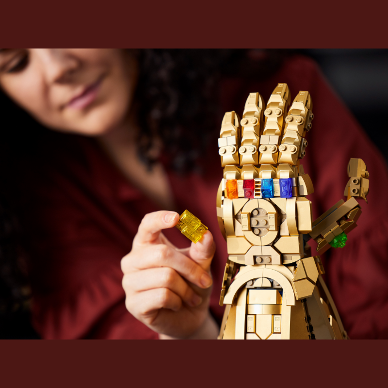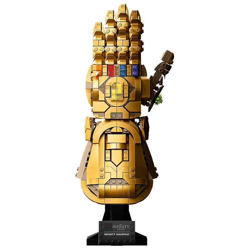 Réplica em blocos da Manopla do Infinito, com as seis Joias do Infinito em cores vibrantes
