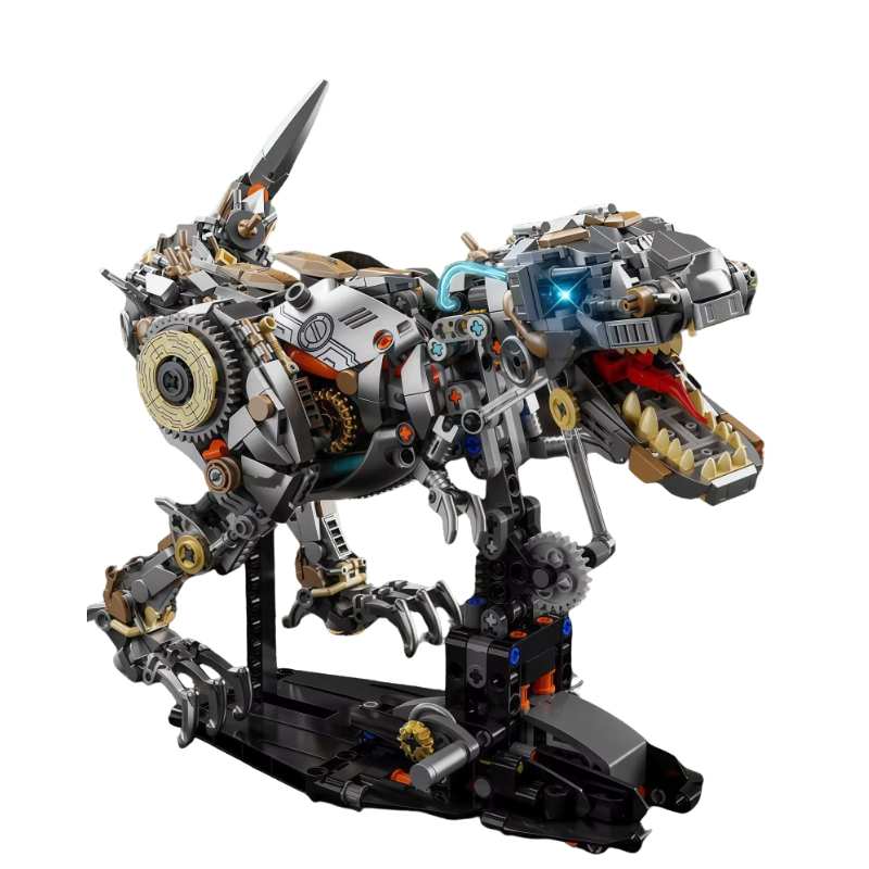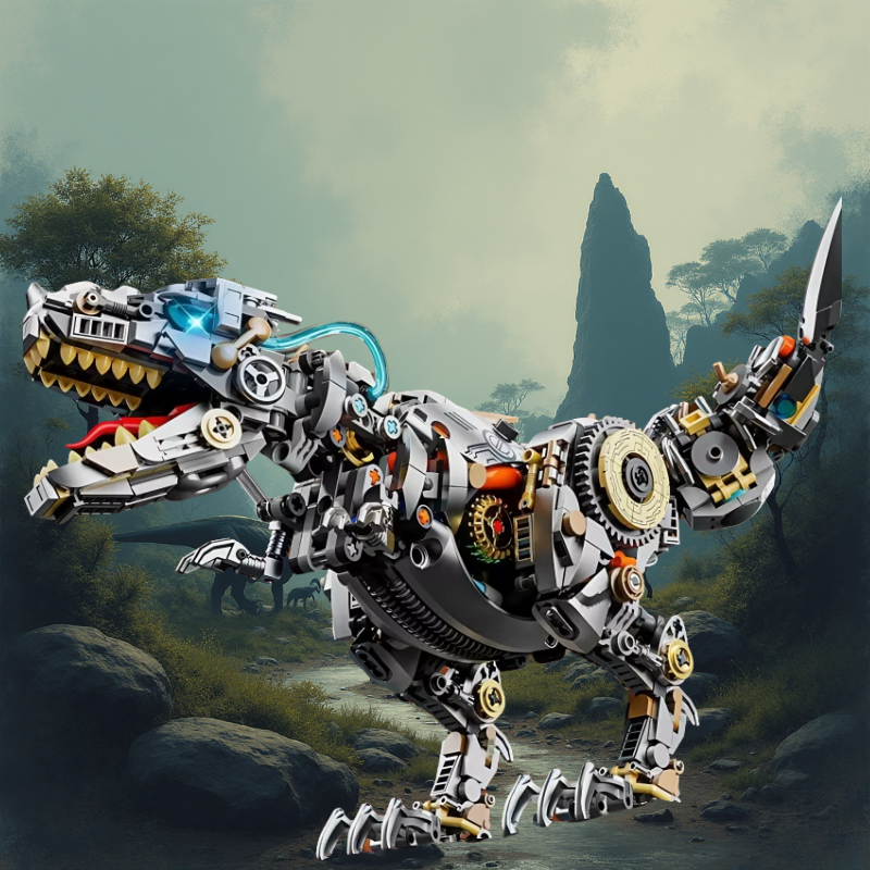 Modelo T-Rex mecânico em blocos de montar, com visual de dinossauro “mecha” futurista