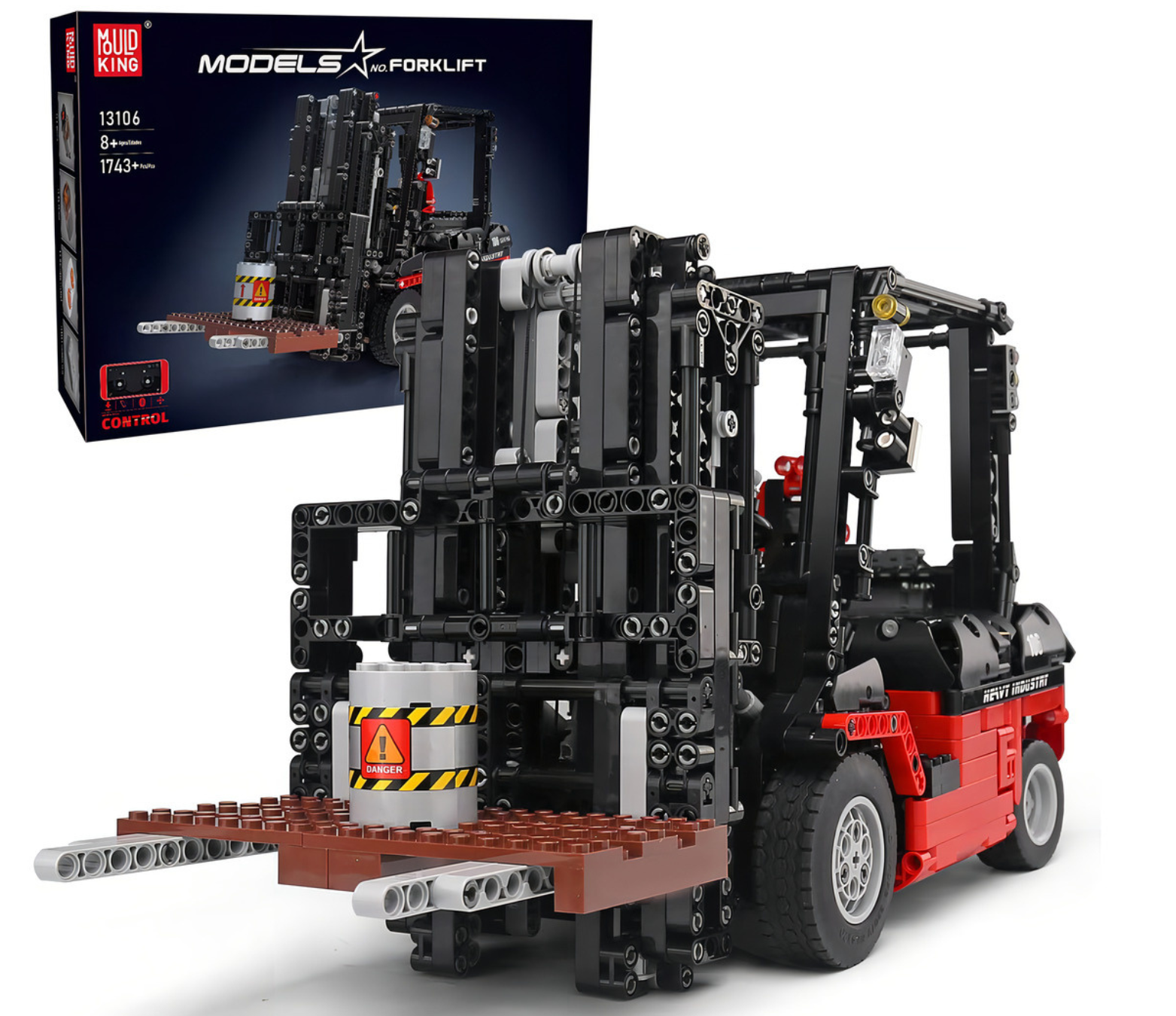 Este conjunto da Mould King (modelo 13106) se destaca como um kit técnico de montagem motorizada: a empilhadeira transforma a experiência de blocos em algo digno de modelismo automotivo. Com cerca de 1.906 peças, permite construir um modelo com elevação real do garfo, rodas direcionais e controle remoto — oferecendo entretenimento, técnica e presença de exibição.