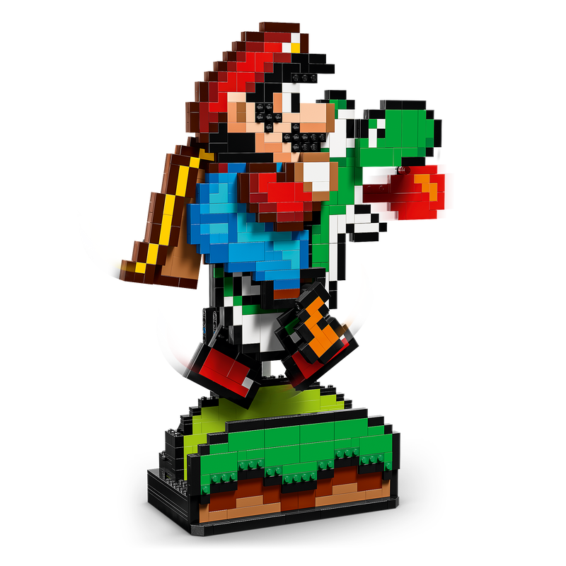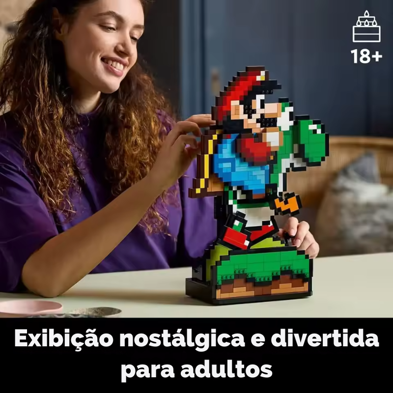 O set Super Mario World Mario e Yoshi em blocos de montar é um modelo de exposição pensado para adulto que cresceu nos games da era 16-bit. Ele recria em estilo pixelado o Mario montado no Yoshi, com efeito de corrida acionado por manivela e a clássica sensação de fase side-scroll da Nintendo.