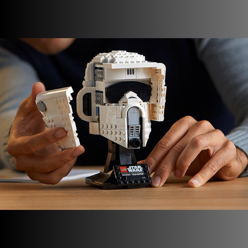 O capacete Scout Trooper em blocos de montar é uma peça obrigatória para qualquer fã de Star Wars que gosta de exposição de verdade na estante. Inspirado na linha de capacetes colecionáveis, ele reproduz o visual icônico dos batedores imperiais com ótima fidelidade em blocos, perfeito para home office, quarto gamer ou setup geek.