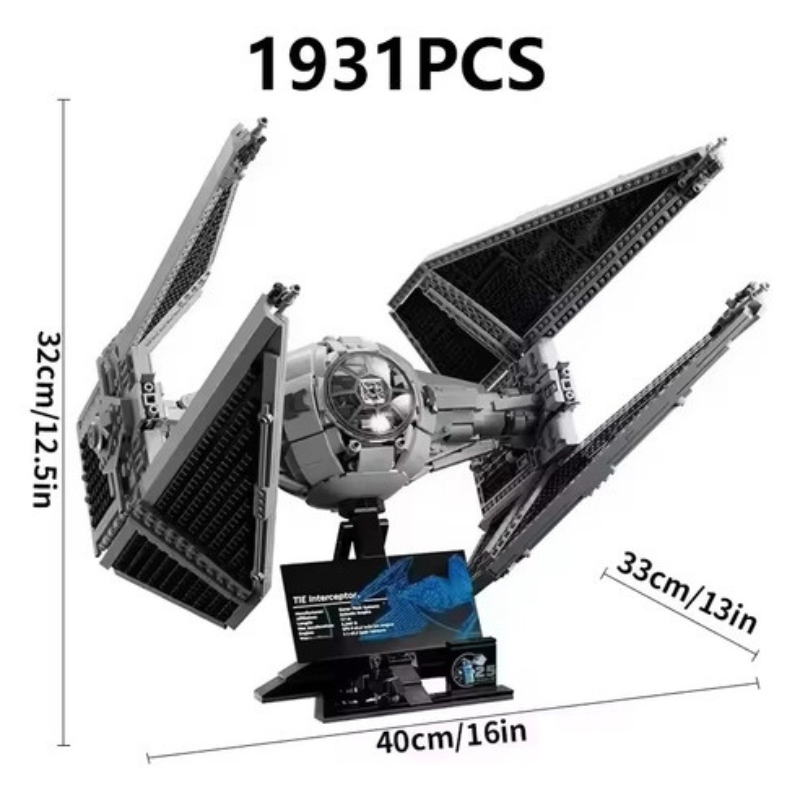 O TIE Interceptor UCS em blocos de montar é um modelo de respeito para quem leva Star Wars a sério. Ele recria o caça Imperial em escala de exposição, com asas agressivas em forma de lâmina, cockpit detalhado e base com inclinação dinâmica de voo.Com 1.931 peças, este é um projeto avançado, feito para montar com calma e curtir cada etapa. Montado, o modelo atinge aproximadamente 32 cm de altura, 40 cm de comprimento e 33 cm de largura (com base), seguindo as dimensões oficiais do UCS original – presença forte em qualquer estante, rack, home office ou setup gamer.