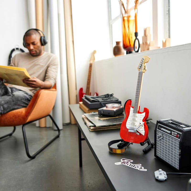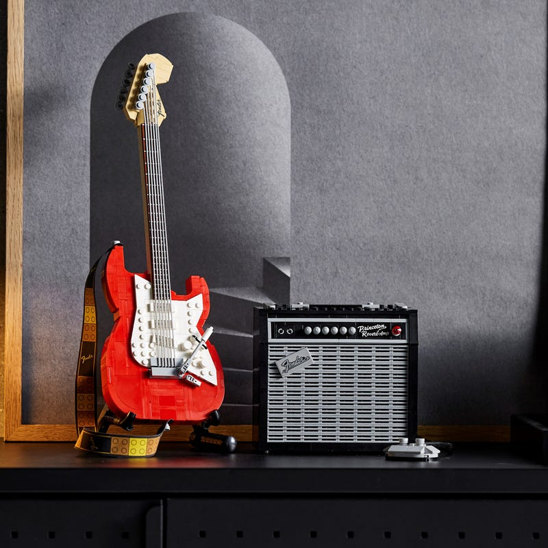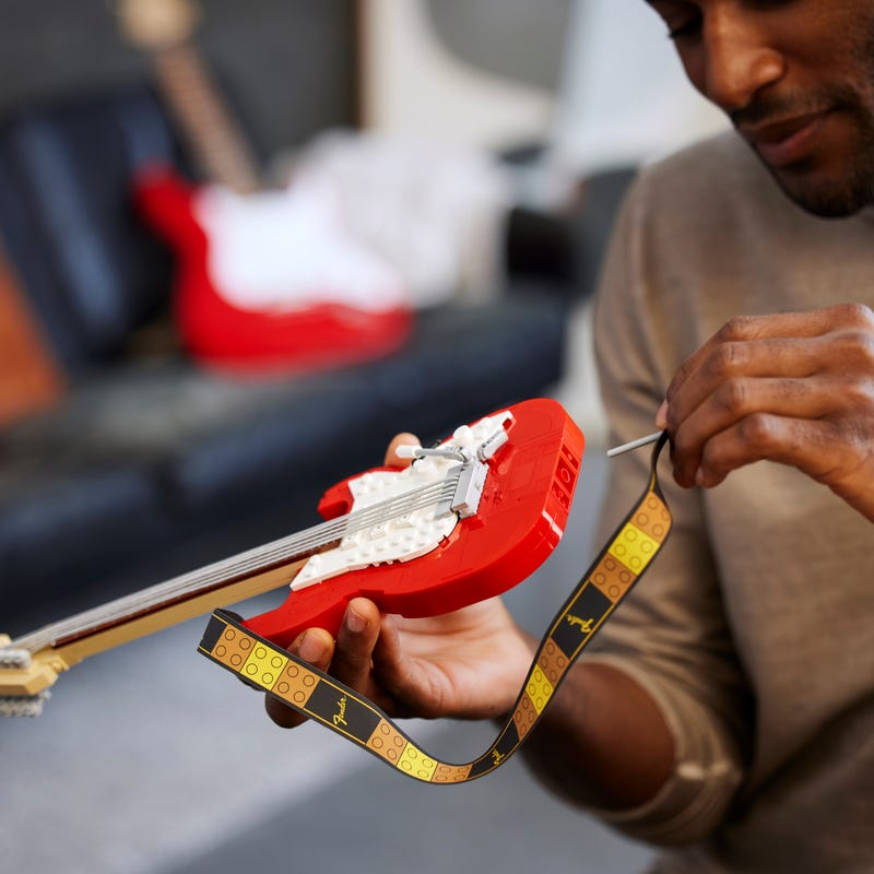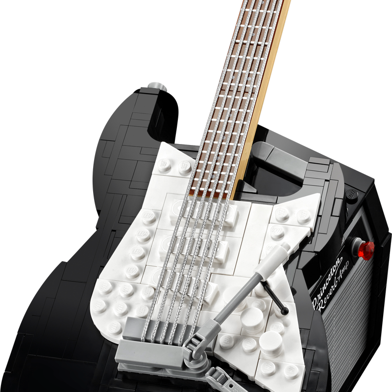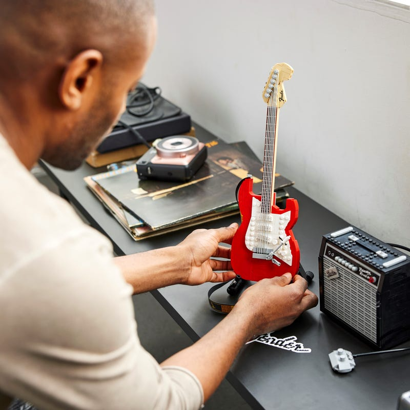 A Guitarra Fender Stratocaster em blocos de montar é um daqueles modelos que viram peça de destaque em qualquer coleção. Inspirada no set LEGO Ideas Fender Stratocaster 21329, ela recria a clássica Strat dos anos 70 com corpo detalhado, headstock característico e visual de guitarra real de estúdio.