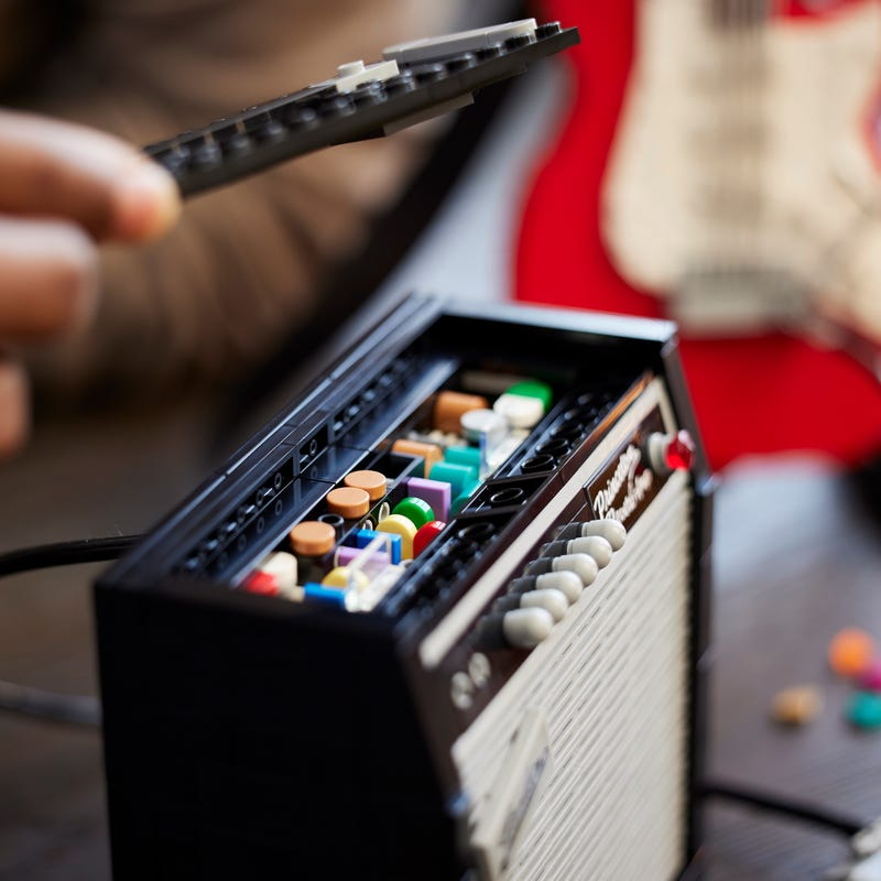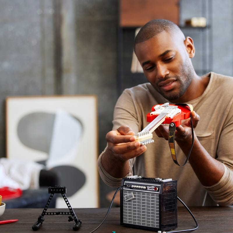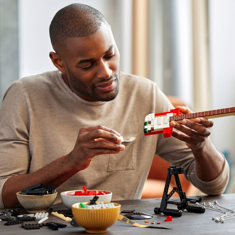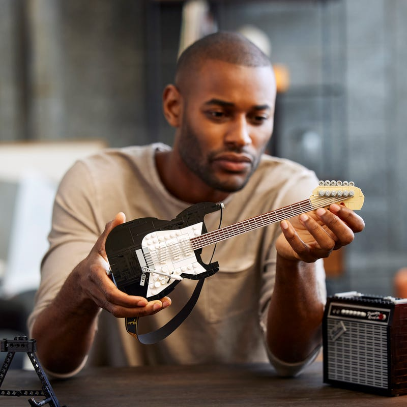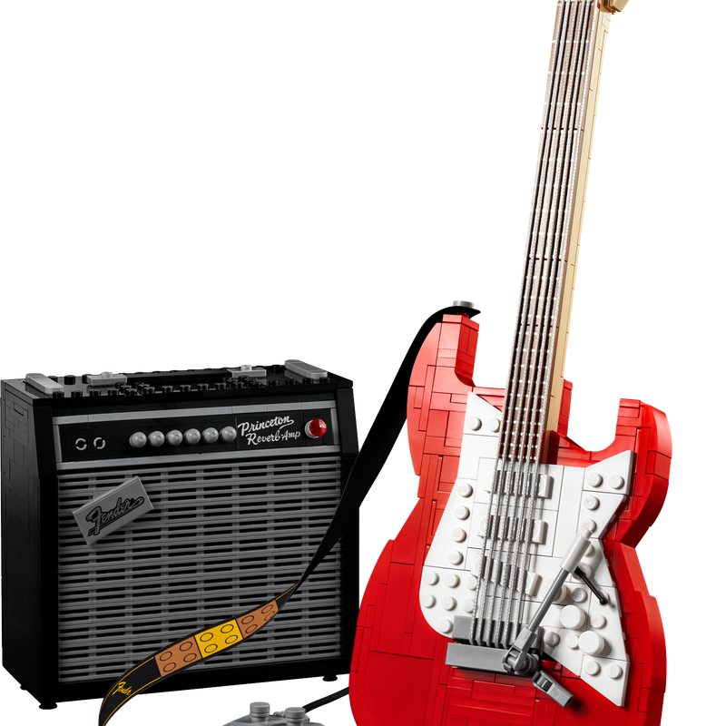 A Guitarra Fender Stratocaster em blocos de montar é um daqueles modelos que viram peça de destaque em qualquer coleção. Inspirada no set LEGO Ideas Fender Stratocaster 21329, ela recria a clássica Strat dos anos 70 com corpo detalhado, headstock característico e visual de guitarra real de estúdio.