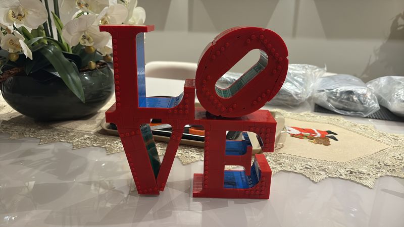 Escultura LOVE em blocos de montar, inspirada na obra icônica de Robert Indiana