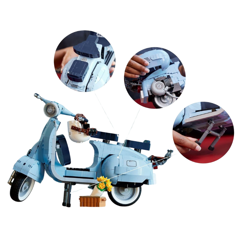 Este kit da Vespa 125 foi criado para quem não se contenta apenas com montar: busca presença de destaque, acabamento refinado e impacto visual autêntico. A montagem desenvolve estilo, forma e nostalgia com precisão, resultando em um modelo que ultrapassa o papel de brinquedo — tornando-se peça de destaque em sua coleção, com identidade clássica, proporções elegantes e uma presença que passe pela sala ou escritório e acende atenção.