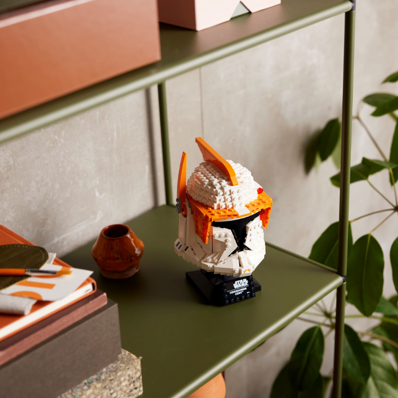 Design fiel ao Capacete do Comandante Cody, com viseira laranja, faixas de identificação e contornos característicos